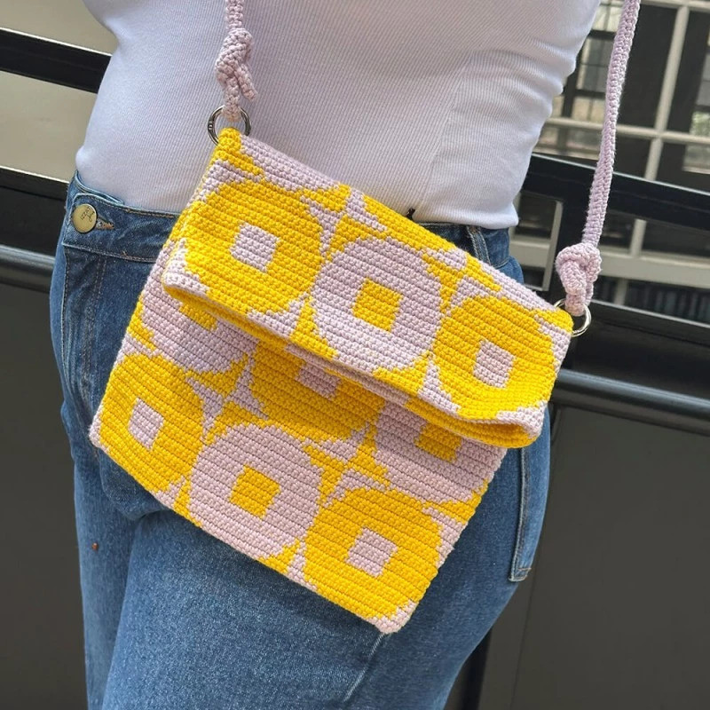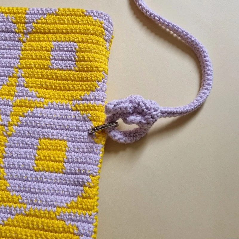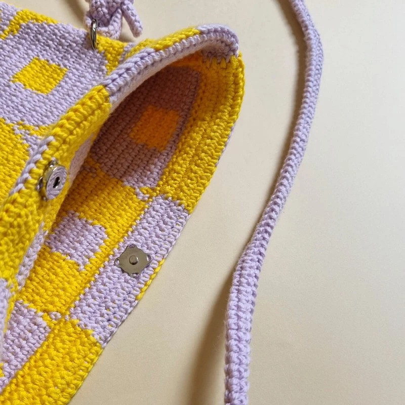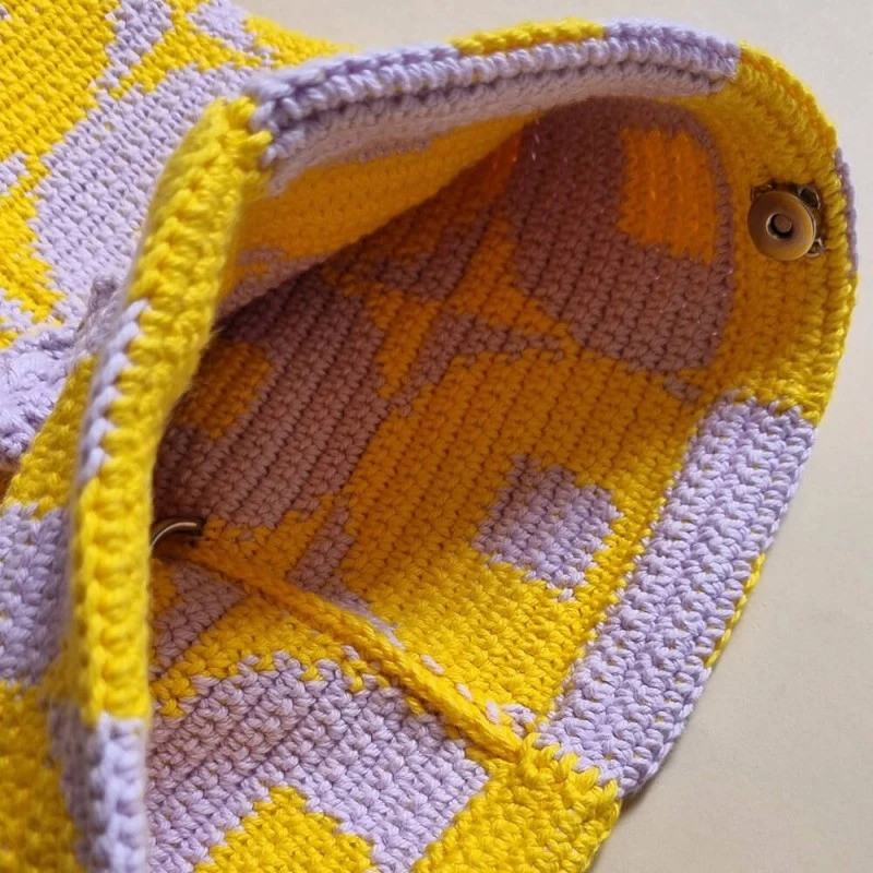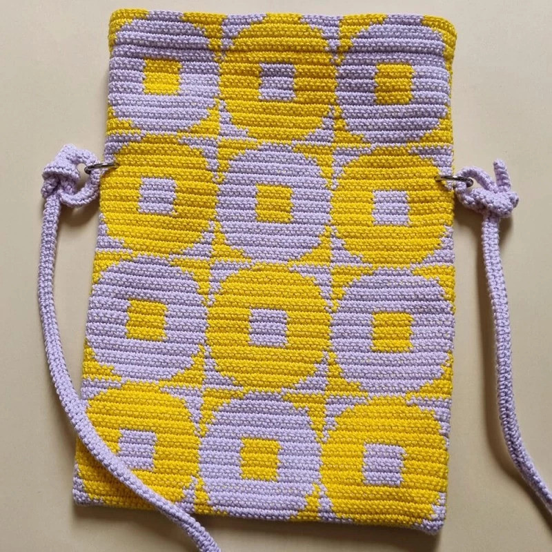A bolsa finalizada apresenta um padrão visual marcante composto pela repetição de círculos com um centro quadrado, criando um efeito óptico geométrico muito original. O design alterna as cores amarelo e lilás em fileiras. Cada círculo é emoldurado contra um fundo da cor oposta, criando um contraste moderno e alegre.
