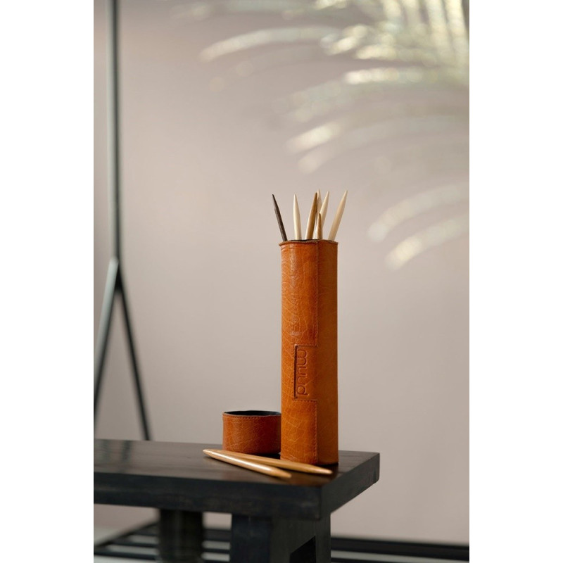 Upsala da marca Dinamarquesa Muud é um lindo tubo de couro feito à mão, projetado para manter as suas agulhas de tricot perfeitamente organizadas.