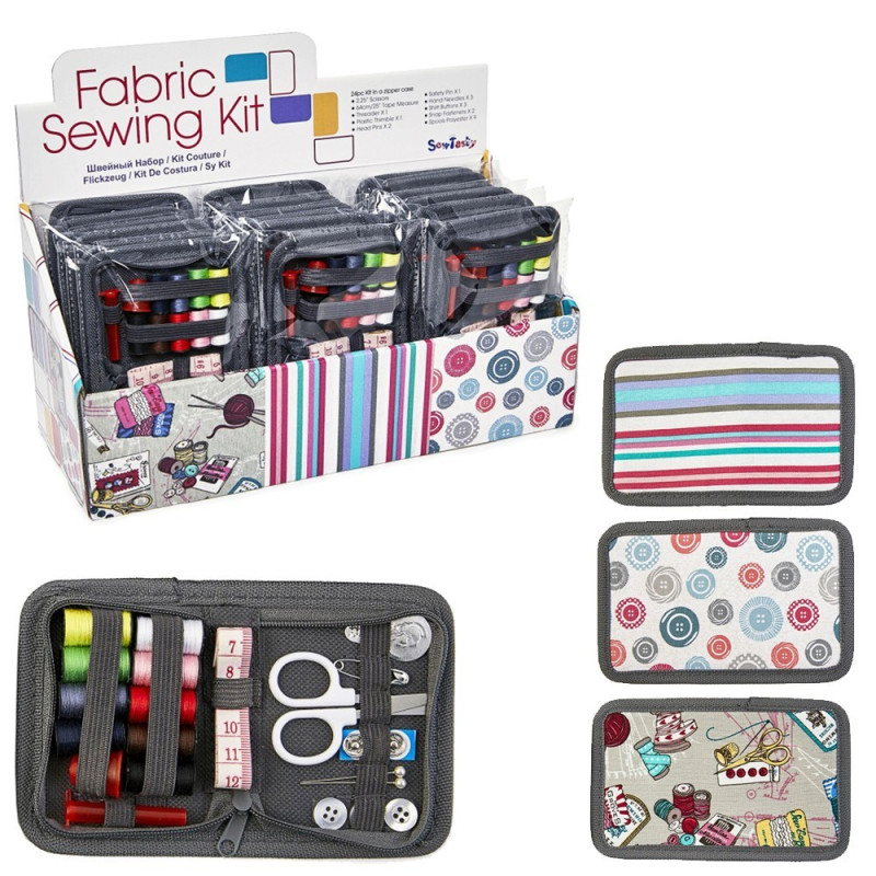 917 321 358**Estojo prático 100% algodão colorido com fecho, contendo itens essenciais para costura e conserto