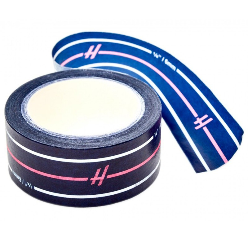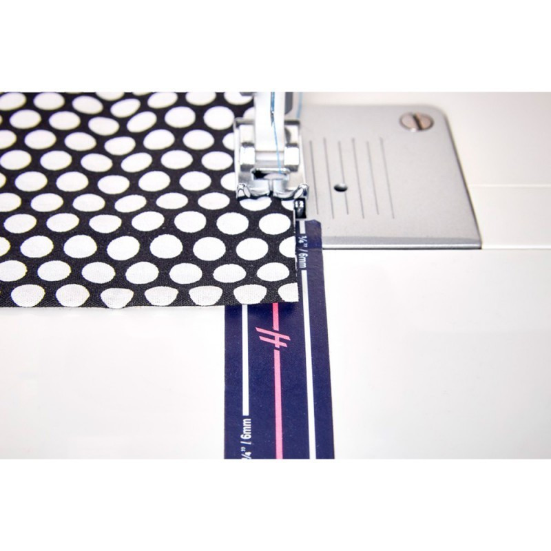 Corte a fita no comprimento desejado (longo o suficiente para se estender até a frente da máquina). Alinhe a linha rosa central com a agulha da máquina de costura e pressione. Remova a fita após o uso. Aplique um pedaço de fita em cada projeto.