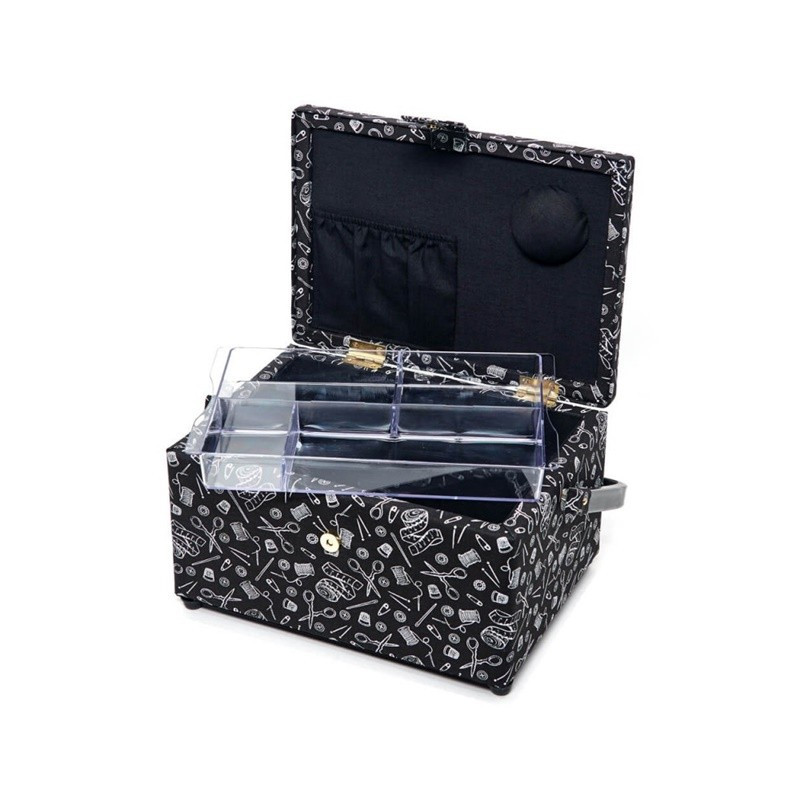 Tem as dimensões de 19 x 26 x 14,5 centímetros, onde encontrará um grande compartimento principal, e uma bandeja plástica removível dividida em 4 seções para que possa organizar pequenos acessórios, como botões ou agulhas. Esta bandeja é transparente, por isso permitirá que você veja completamente o compartimento principal.
