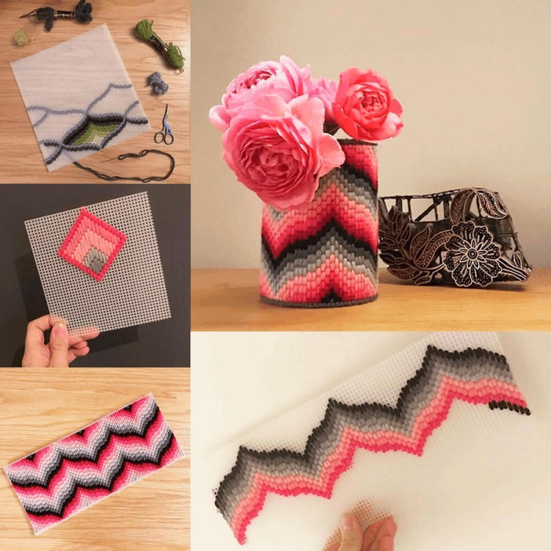 Pode usá-la para fazer carteiras, bolsas, tapetes, toalhas de mesa, porta-copos, ímãns, alfinetes, porta-guardanapos, porta-lápis e muitas outras ideias. Basta bordar a malha plástica para criar o desenho desejado e cortá-la no tamanho desejado. Pode fazer bordados planos ou 3D.