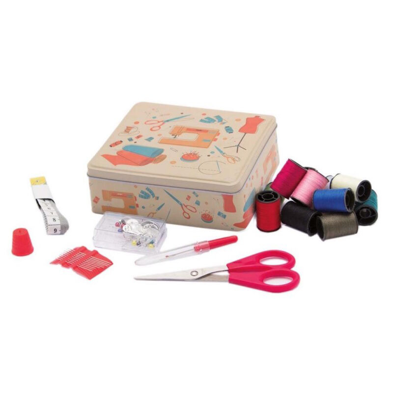 917 321 358**Esta caixa de costura metálica contém todos os itens necessários para costura, como tesoura, alfinetes de segurança, agulhas, fita métrica e muitos outros acessórios úteis, incluindo linhas de costura de diferentes cores.