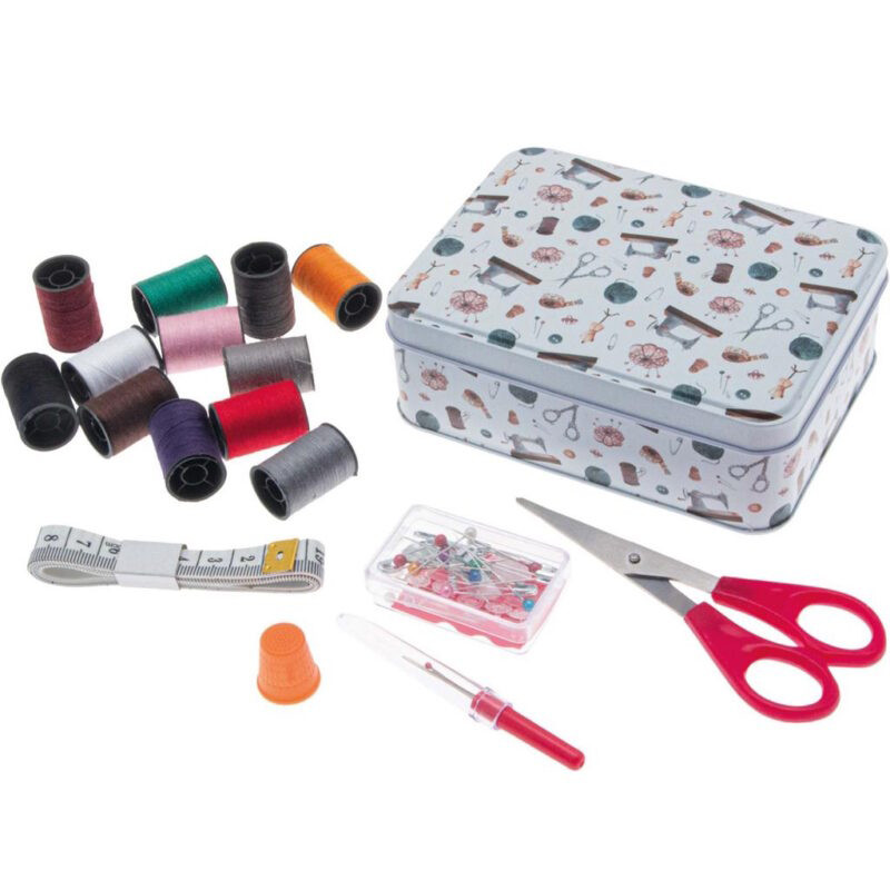 917 321 358**Esta caixa de costura metálica contém todos os itens necessários para costura, como tesoura, alfinetes de segurança, agulhas, fita métrica e muitos outros acessórios úteis, incluindo linhas de costura de diferentes cores.