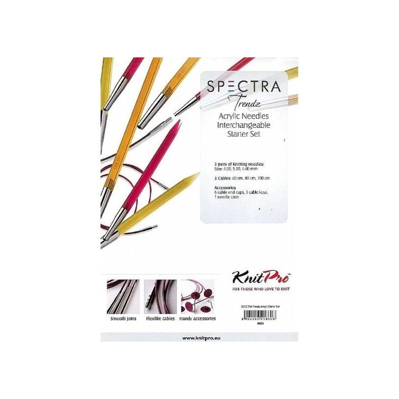 917 321 358**KnitPro Spectra Trendz Acryl Chunky - Kit de agulhas circulares para tricot intercambiáveis em acrílico transparente da marca KnitPro. Inclui 3 cabos (60, 80 e 100cm), três pares de agulhas (4mm; 5mm e 6mm) e 6 bloqueadores para deixar as malhas em descanso nos cabos sem que elas se soltem e 3 chaves.