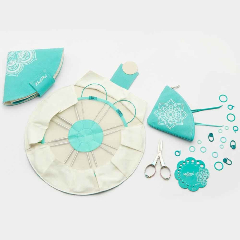As agulhas circulares são fornecidas numa bolsa circular exclusiva que pode ser dobrada duas vezes em forma triangular. No interior da caixa, os tamanhos das agulhas estão claramente marcados nos diferentes compartimentos feitos de tecido transparente, para que as agulhas possam ser armazenadas de forma organizada. Os acessórios podem ser armazenados na pequena bolsa triangular separada com zíper. Os detalhes em cor verde-azulado e o motivo floral neste conjunto são característicos da coleção KnitPro Mindful.