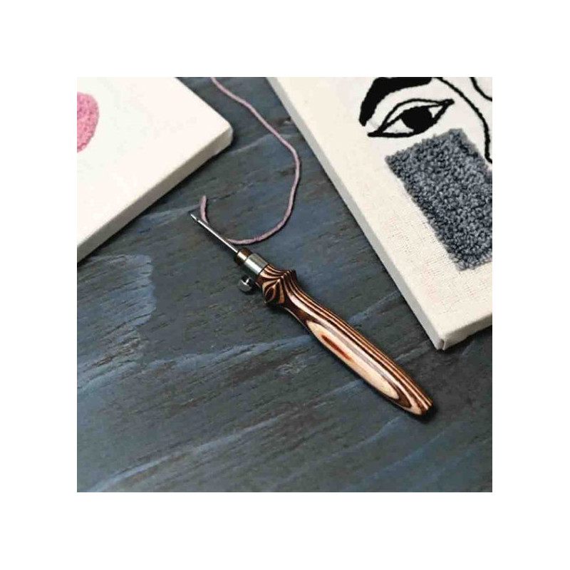 O cabo de madeira é uma verdadeira joia, pensando no conforto durante longas sessões criativas. Suas características ergonômicas garantem uma pegada confortável e controle preciso sobre os pontos, resultando num processo de bordado sem esforço.