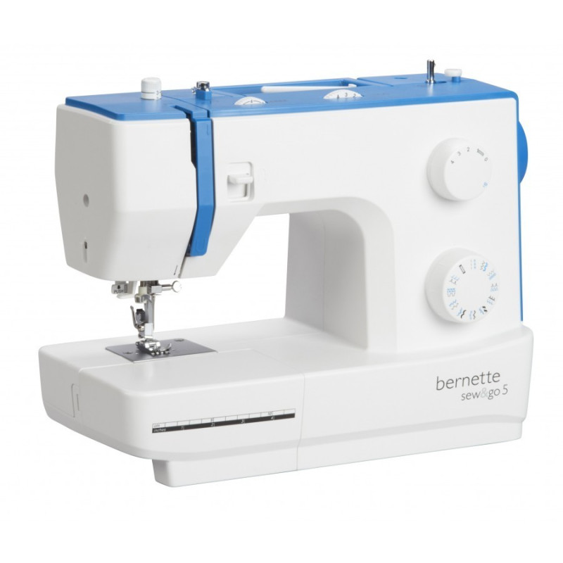 A Bernette Sew & Go 5 é o modelo superior das 3 máquinas de costura mecânicas. Possui 23 pontos, incluindo casas de botão com largura máxima de 5mm. Os dois botões na parte frontal da máquina e a roda na parte superior podem ser usados para definir a tensão da linha ou o comprimento do ponto, bem como para selecionar pontos. O enfiador de linha semi automático e o cortador de linhas ajudam a costurar rapidamente e com facilidade.