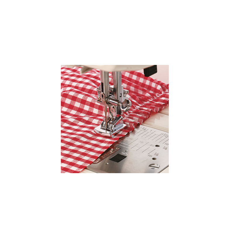 Com este calcador consegue, ao mesmo tempo, franzir a camada inferior de tecido e costurar a camada superior para juntar ambas de forma perfeita graças à forma como o calcador guia a costura.