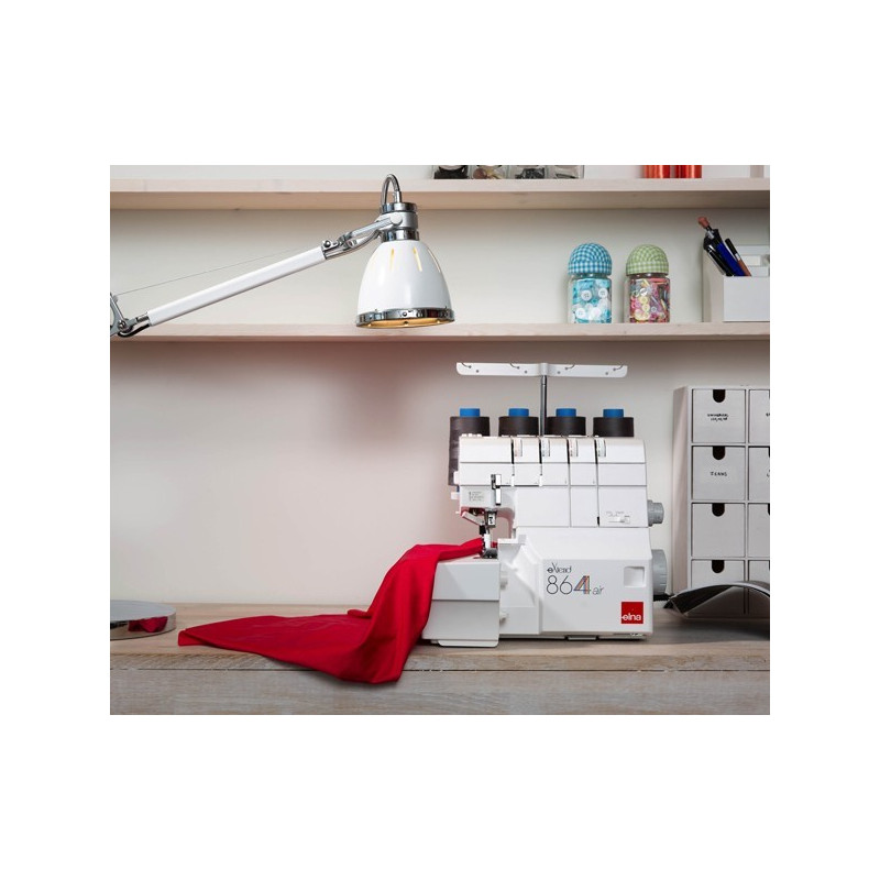 A máquina corta e cose ELNA 864air é uma máquina de Overlock de 4 linhas, executa costuras de 4/3/2 linhas e uma costura de trava plana de 3 linhas. Com enfiador automático de agulhas e sistema de enfiar botões para as alças inferiores e superiores.