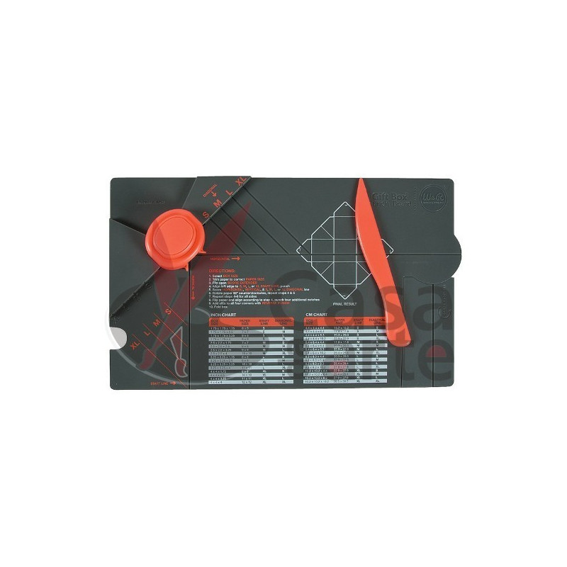 917 321 358**We R Memory Keepers - Gift Box Punch Boarder - Placa de dobragem de caixas quadradas e cúbicas para papeis e cartolinas. Fácil de usar, permite fazer os mais diversos tamanhos de caixas. Inclui tabela de medidas, furador de 2 lados e acessório para vincar (dobradeira).