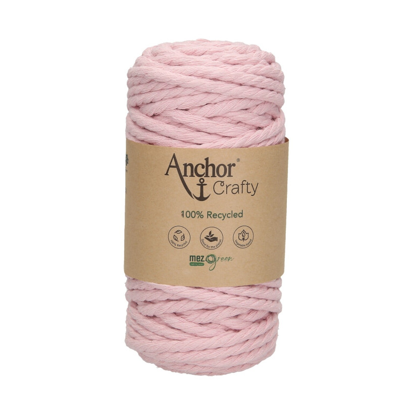 Anchor Crafty é um fio 100% reciclado fabricado a partir de resíduos têxteis e plásticos, tornando-o amigo do ambiente e sustentável. O fio é corda na sua construção; composto por um cordão macio de 3 camadas torcidas com cerca de 5 mm de espessura, muito fácil de trabalhar, ideal para iniciantes no artesanato e para projetos de rápida execução.