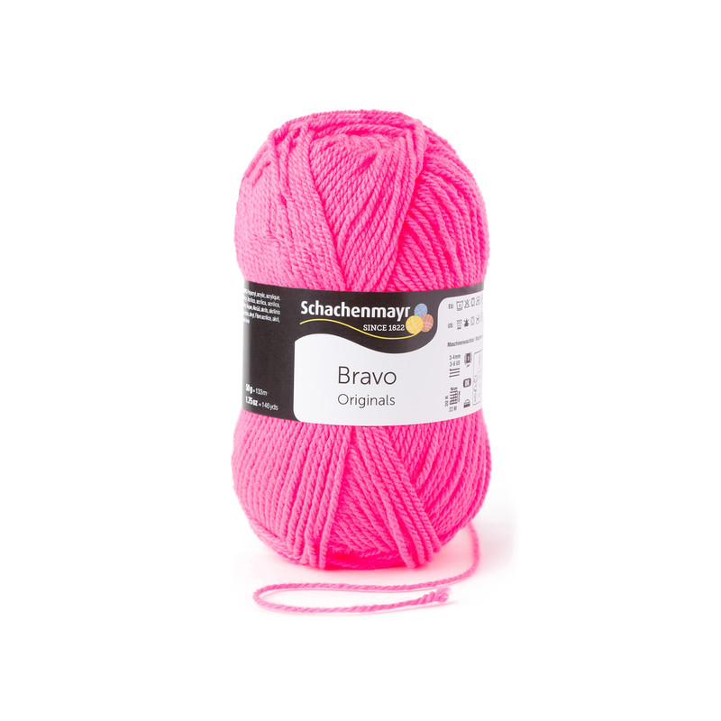Bravo, da Schachenmayr, é um fio acrílico disponível em novelos de 50 gramas em cores vibrantes. É perfeito para tricotar peças de vestuário, acessórios e outros projetos, como mantas de quadradinhos de crochê ou outras técnicas.