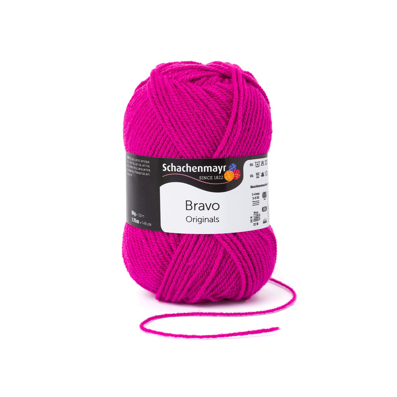 Bravo, da Schachenmayr, é um fio acrílico disponível em novelos de 50 gramas em cores vibrantes. É perfeito para tricotar peças de vestuário, acessórios e outros projetos, como mantas de quadradinhos de crochê ou outras técnicas.