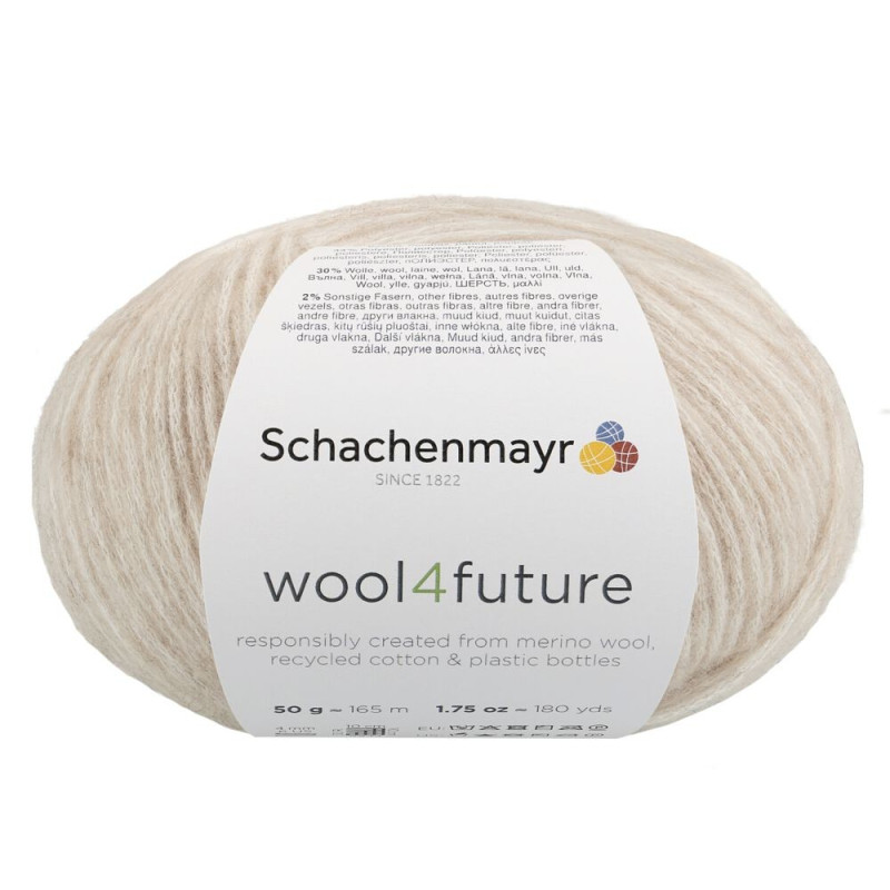 O wool4future é um fio sustentável feito a partir de uma rede de algodão reciclado, que é preenchida com poliéster reciclado e fibras de merino, dando um toque macio ao fio. O algodão é obtido a partir de sobras da produção têxtil e o poliéster vem de garrafas plásticas recicladas, que são decompostas em grânulos únicos e fiadas em novos fios. Este fio é um peso DK padrão e adequado para uma ampla gama de designs, desde acessórios até roupas.