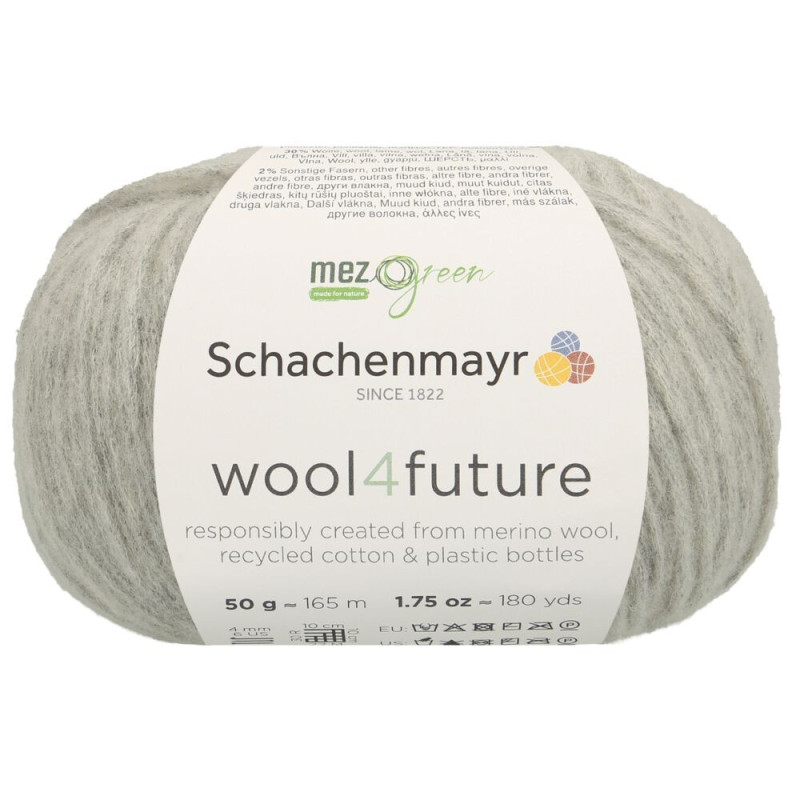 O wool4future é um fio sustentável feito a partir de uma rede de algodão reciclado, que é preenchida com poliéster reciclado e fibras de merino, dando um toque macio ao fio. O algodão é obtido a partir de sobras da produção têxtil e o poliéster vem de garrafas plásticas recicladas, que são decompostas em grânulos únicos e fiadas em novos fios. Este fio é um peso DK padrão e adequado para uma ampla gama de designs, desde acessórios até roupas.