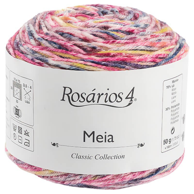 Meia Print é um fio colorido, feito de lã merino e poliamida. Essa composição proporciona total conforto, pois enquanto a lã merino oferece maciez e doçura ao toque, a poliamida dá um ponto extra de flexibilidade para que seus projetos se adaptem a cada movimento. Isso o torna especial para meias de tricot.