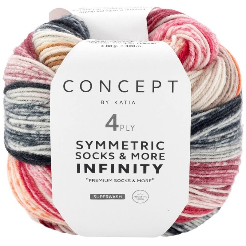 Explore um novo nível de cor e estilo com Katia Symmetric Socks & More Infinity 4-ply , o fio ideal para quem busca um design moderno e dinâmico em seus tricôs. Composto por 75% lã virgem e 25% poliamida, este fio se destaca pelo efeito de listras finas e contínuas, criando um acabamento visual suave e fluido.