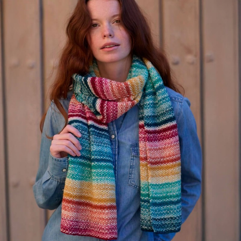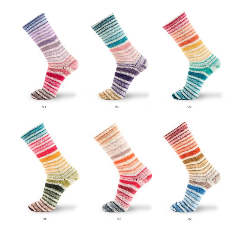 Cada novelo de 80 gramas e 320 metros é suficiente para tricotar um par de meias simétricas ou um elegante cachecol. O fio muda de cor automaticamente, formando um padrão elegante e vibrante.