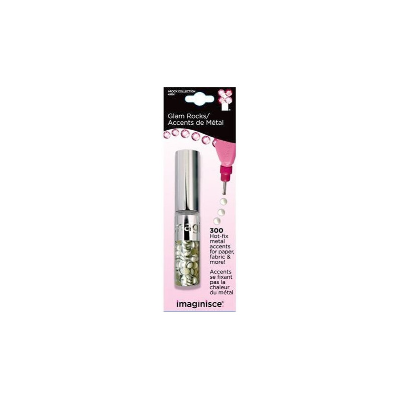 I-Rock da Imaginisce - Cada  peça é auto-adesiva e só precisa de um toque de calor a partir da ferramenta I-Rock  para poder ser utilizada em qualquer projecto. Cada pacote inclui 300 pequenas "glam rocks de metal" de 4mm.