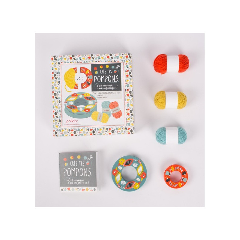 Kit composto por 3 novelos de lã , 2 moldes magnéticos e Instruções.