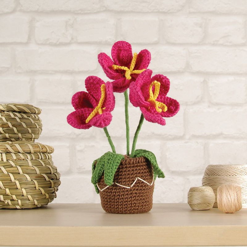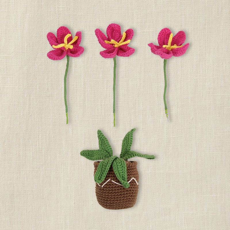 O vaso de flores em amigurumi, desenhado por Nuria Picos, dará um toque natural à decoração da sua casa sem necessidade de manutenção! O kit contém tudo o que é necessário para realizar o projeto, incluindo dois novelos de Happy Cotton, cinco meadas de Retors Mat, uma agulha de crochet de 3 mm e uma agulha para coser.