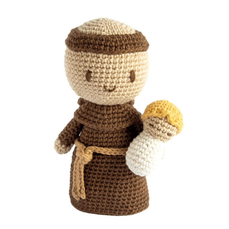 Modelo de um boneco inspirado pelo Santo António de Lisboa com o menino Jesus ao colo.