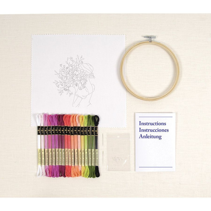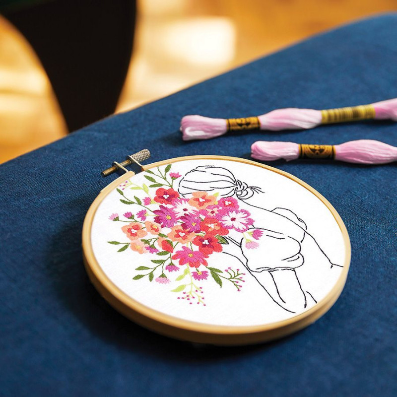 Este desenho de Nathalie Weinzaepflen apresenta uma silhueta feminina elegante segurando um ramo de flores colorido. Dê vida ao desenho usando 18 tons vibrantes de Mouliné Spécial DMC. Se precisar de ajuda com algum dos pontos, consulte o guia de diagramas passo a passo e os tutoriais em vídeo no site da DMC.