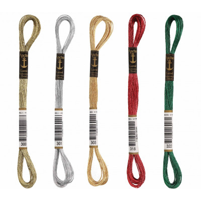 Anchor Lamé é feito de 65% viscose e 35% poliéster metalizado para um brilho superior e efeito metálico. Está disponível em 5 cores metálicas e cada meada tem 8 m de fio, consistindo em 12 fios que podem ser divididos em função da espessura necessária.