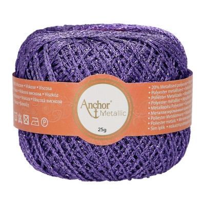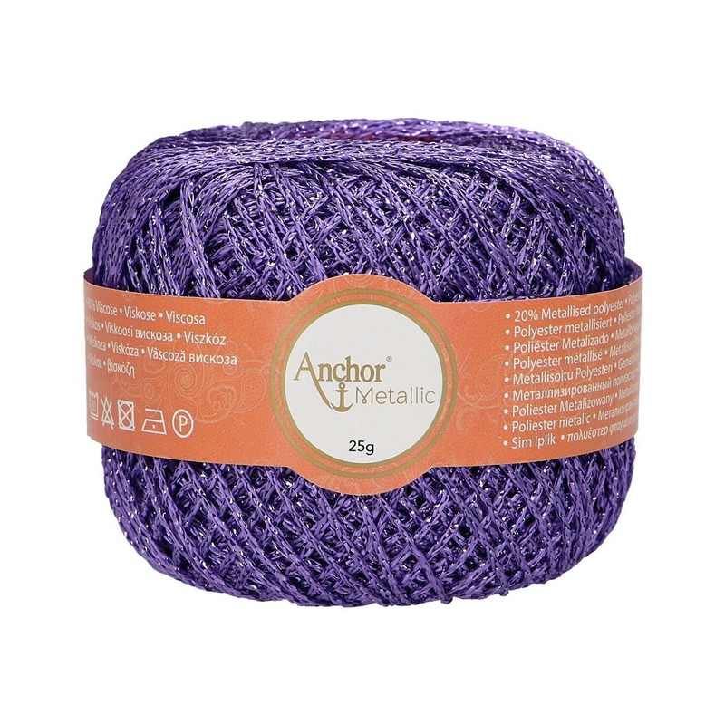 Anchor Metallic é um fio fino obtido de uma mistura de viscose (80%) e poliéster metalizado (20%) que lhe confere um efeito metálico lustroso, mantendo um toque suave. É perfeito para vestuário, acessórios de moda e projetos de decoração para casa e é especialmente popular para ocasiões festivas como o Natal.
