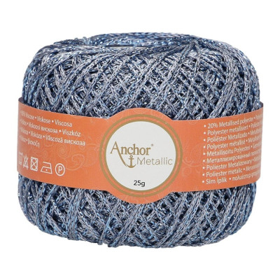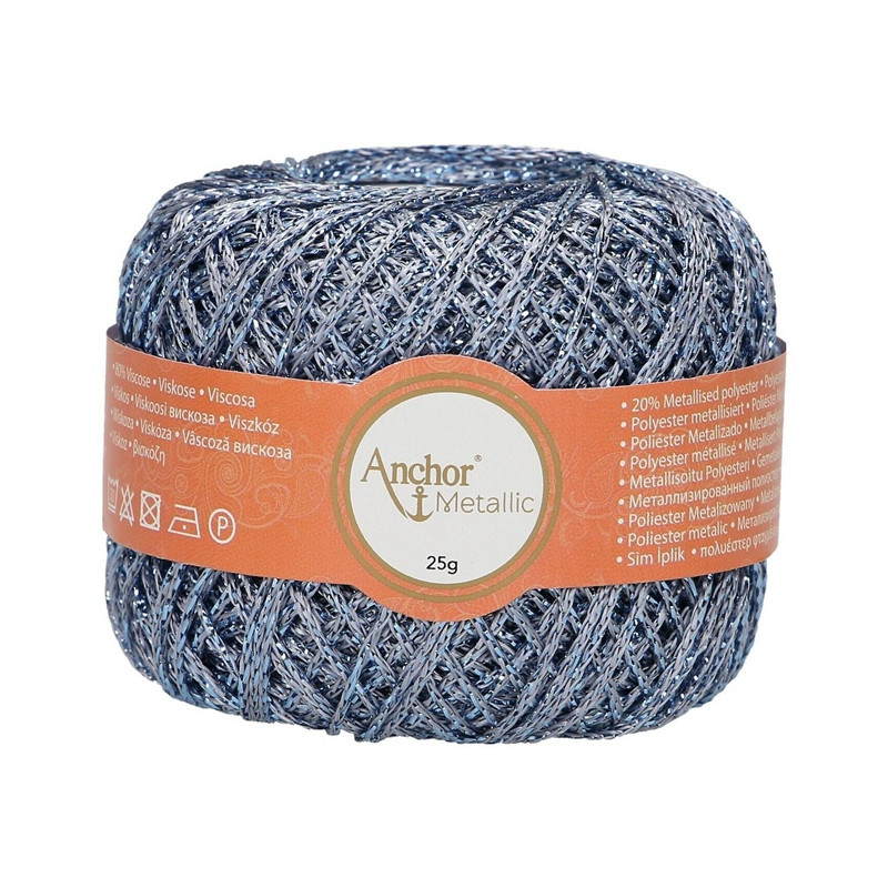 Anchor Metallic é um fio fino obtido de uma mistura de viscose (80%) e poliéster metalizado (20%) que lhe confere um efeito metálico lustroso, mantendo um toque suave. É perfeito para vestuário, acessórios de moda e projetos de decoração para casa e é especialmente popular para ocasiões festivas como o Natal.