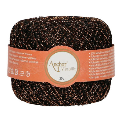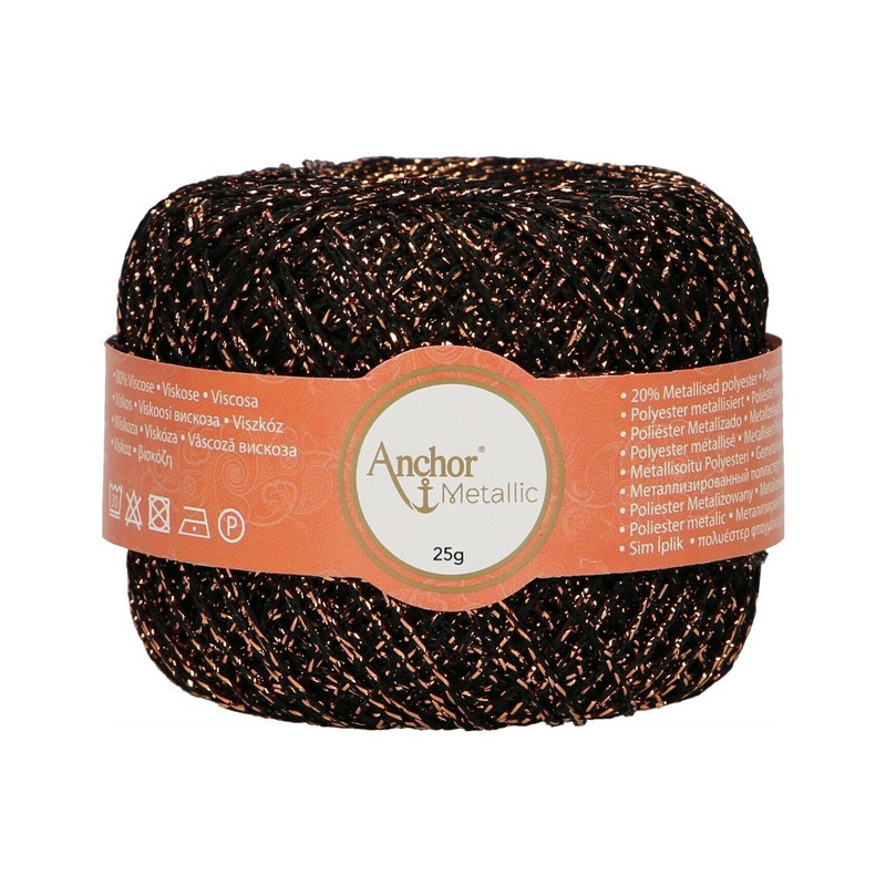 Anchor Metallic é um fio fino obtido de uma mistura de viscose (80%) e poliéster metalizado (20%) que lhe confere um efeito metálico lustroso, mantendo um toque suave. É perfeito para vestuário, acessórios de moda e projetos de decoração para casa e é especialmente popular para ocasiões festivas como o Natal.