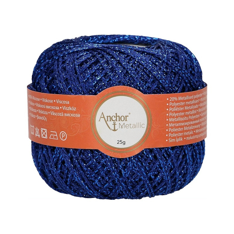 Anchor Metallic é um fio fino obtido de uma mistura de viscose (80%) e poliéster metalizado (20%) que lhe confere um efeito metálico lustroso, mantendo um toque suave. É perfeito para vestuário, acessórios de moda e projetos de decoração para casa e é especialmente popular para ocasiões festivas como o Natal.