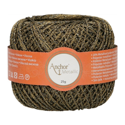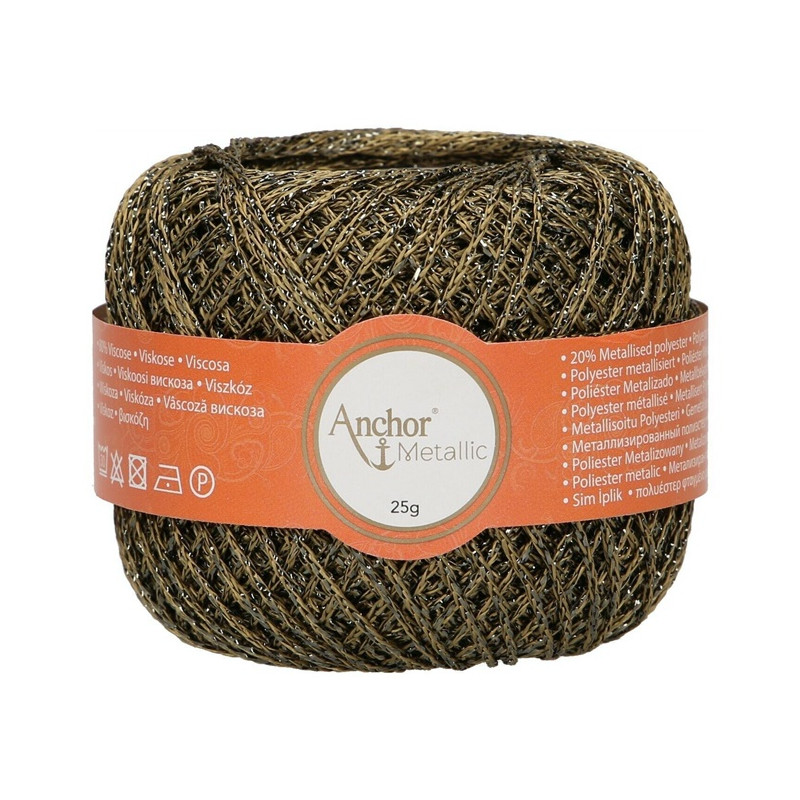 917 321 358**Anchor Metallic é um fio fino obtido de uma mistura de viscose (80%) e poliéster metalizado (20%) que lhe confere um efeito metálico lustroso, mantendo um toque suave. É perfeito para vestuário, acessórios de moda e projetos de decoração para casa e é especialmente popular para ocasiões festivas como o Natal.