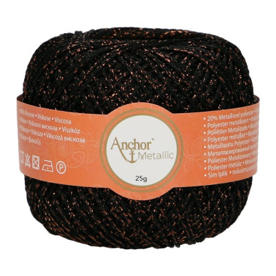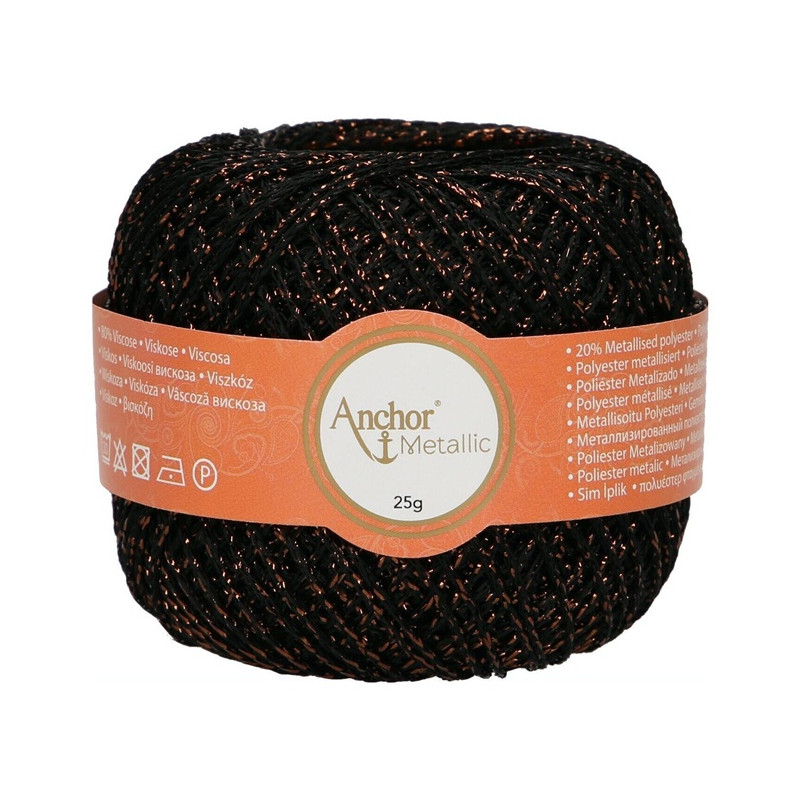 Anchor Metallic é um fio fino obtido de uma mistura de viscose (80%) e poliéster metalizado (20%) que lhe confere um efeito metálico lustroso, mantendo um toque suave. É perfeito para vestuário, acessórios de moda e projetos de decoração para casa e é especialmente popular para ocasiões festivas como o Natal.