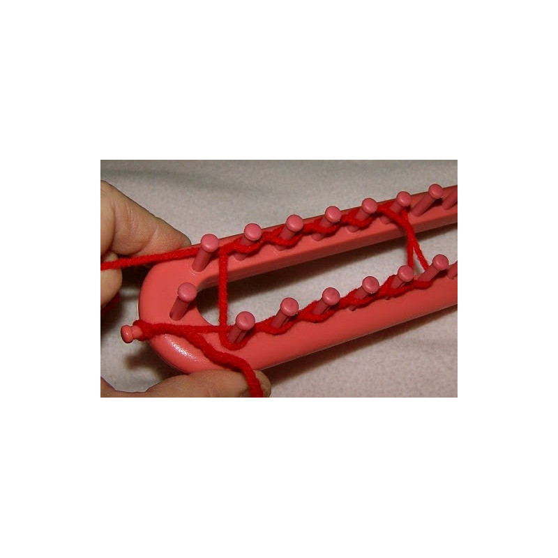 Os pinos do tear atuarão como as 2 agulhas de tricot. Enrole seus fios de lã ou fios em volta dos pinos e trabalhe com a agulha.