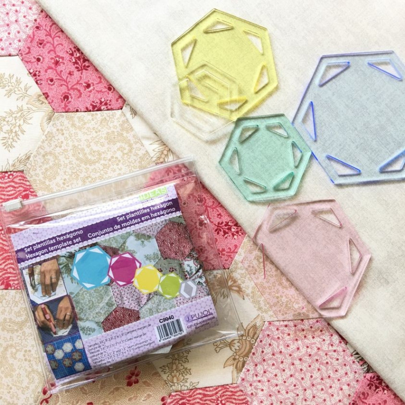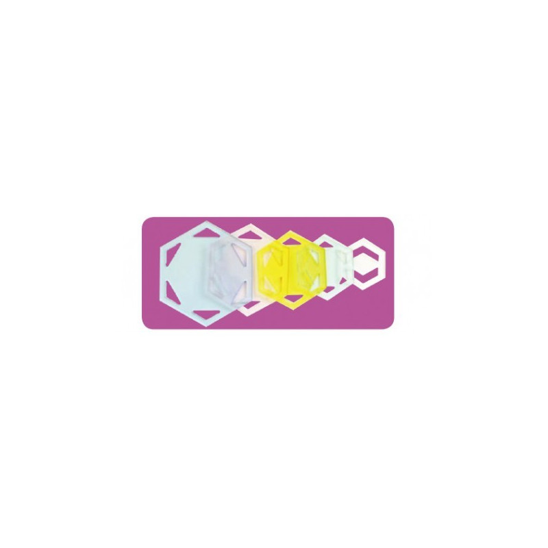 Conjunto de 5 réguas transparentes de metacrilato colorido (cada uma de uma cor diferente) para cortar peças hexagonais.