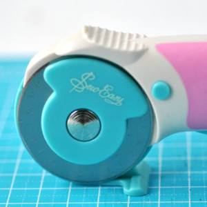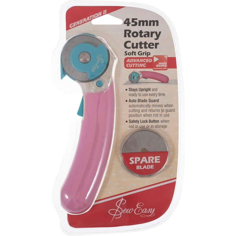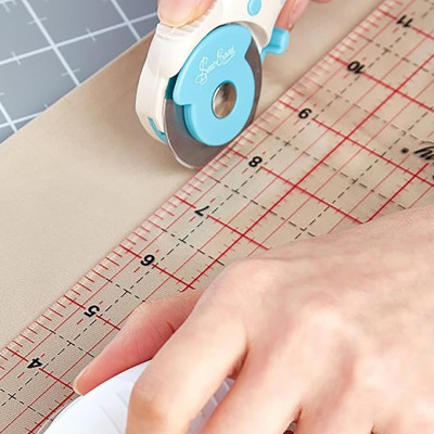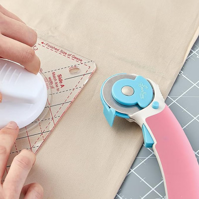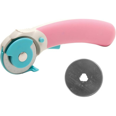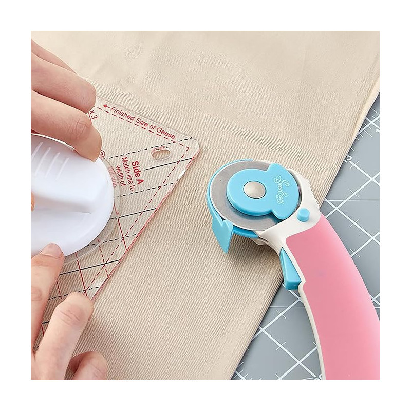 O cortador rotativo tradicional para tecidos, mas com um design ergonômico especial e uma pega muito macia e confortável. Acompanha instruções e uma lâmina de reserva, permanecendo na vertical quando não estiver em uso, pronto para uso a qualquer momento. Possui um "protetor automático de lâmina", que se move automaticamente durante o corte e retorna à posição de proteção quando não estiver em uso, além de um botão de trava de segurança (em uso ou guardado).