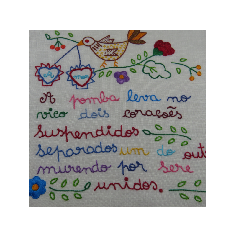 Cada lenço é uma peça única, que retrata sentimentos amorosos. As frases são escritas com erros ortográficos devido à idade e escolaridade das primeiras bordadeiras, era a fonética que importava. É um quadrado não perfeito.