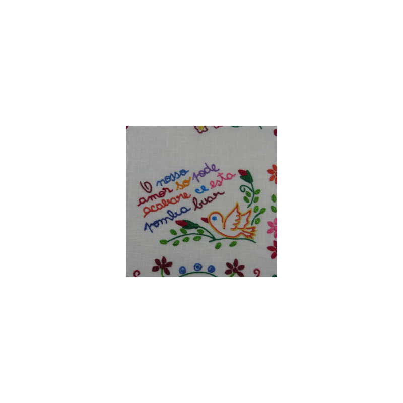 Cada lenço é uma peça única, que retrata sentimentos amorosos. As frases são escritas com erros ortográficos devido à idade e escolaridade das primeiras bordadeiras, era a fonética que importava. É um quadrado não perfeito.