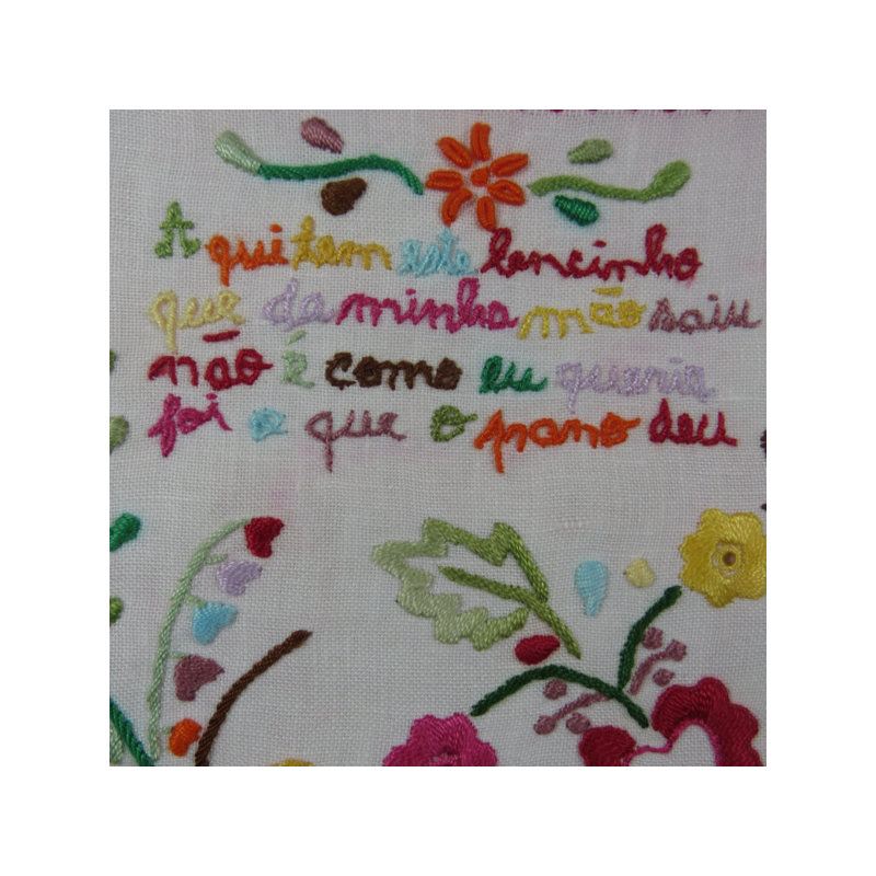 Cada lenço é uma peça única, que retrata sentimentos amorosos. As frases são escritas com erros ortográficos devido à idade e escolaridade das primeiras bordadeiras, era a fonética que importava. É um quadrado não perfeito.